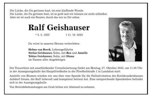 Um Ralf Geishauser trauern zwei Söhne mit ihren Familien und die Lebensgefährtin. Die Handballer des TSV Rottenburg und des ETSV 09 Landshut wollen ihres verstorben Sportkameraden beim Bezirksligaderby am Sonntag um 16.30 Uhr in der Rottenburger Mehrzweckhalle in Form einer Schweigeminute gemeinsam gedenken. Die Urnenbeisetzung von Ralf Geishauser findet am Montag, 27. Oktober 2025, um 11 Uhr im Landshuter Hauptfriedhof statt.